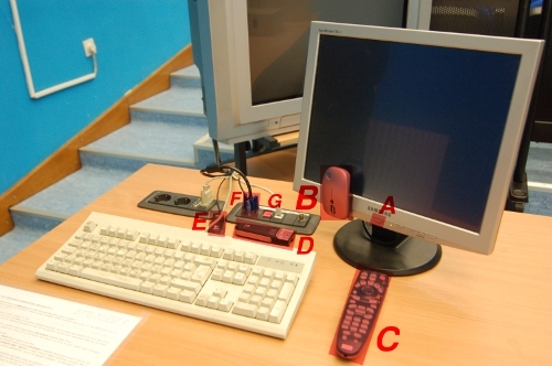 • F: VGA (video) i 3,5mm TRS (audio) utori za spajanje prijenosnog računala (prethodno je potrebno iskopčati kablove stolnog računala na katedri, a po završetku iste obavezno ponovno ukopčati)